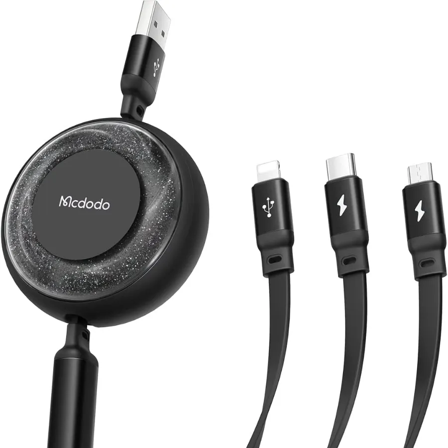 ثلاثة في واحد: يتضمن الكابل ثلاثة موصلات: Lightning (لأجهزة iOS)، و USB Type-C، و Micro USB، مما يجعله متوافقًا مع معظم الهواتف الذكية والأجهزة اللوحية.